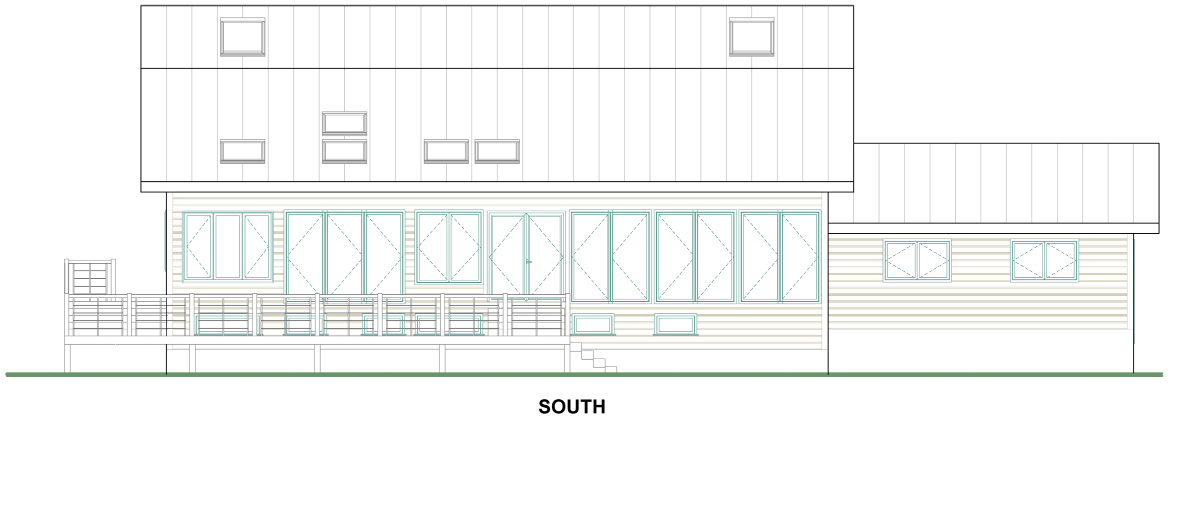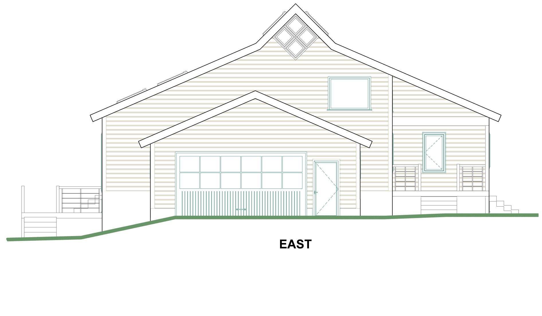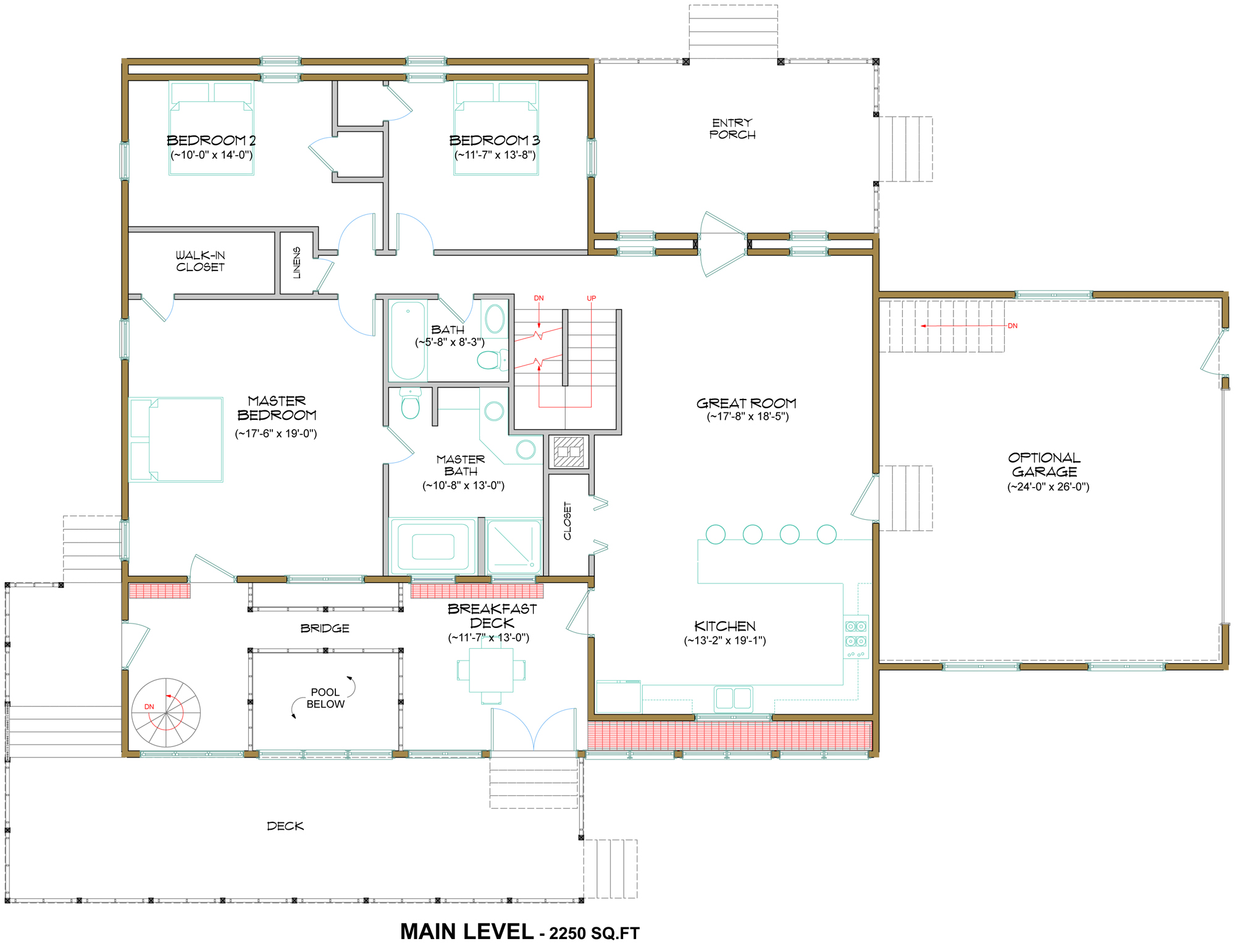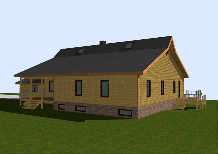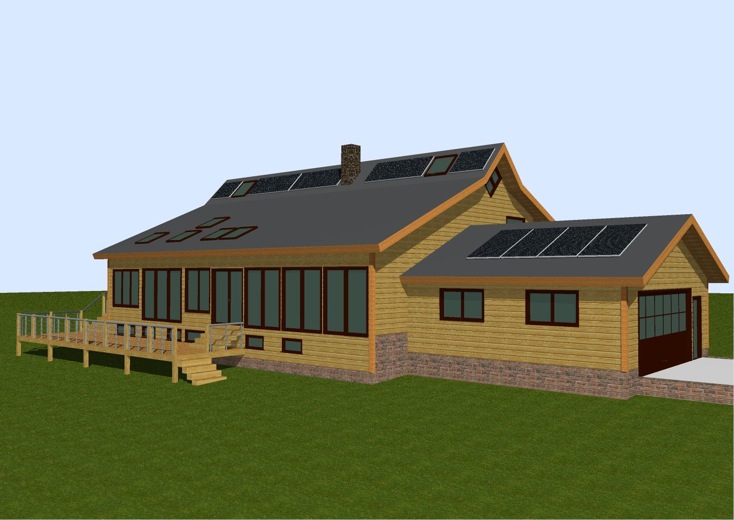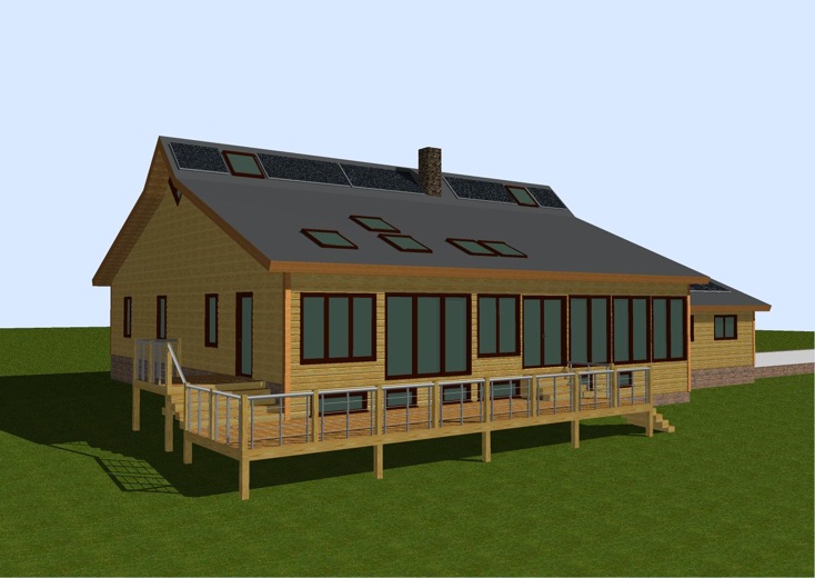 A large single-story on a basement, the Terra is based on a Texas Ranch style. But the twin pitch Hawaiian roof is optimal for solar panels. A bridge in the sunspace looks over the lap pool in the basement.