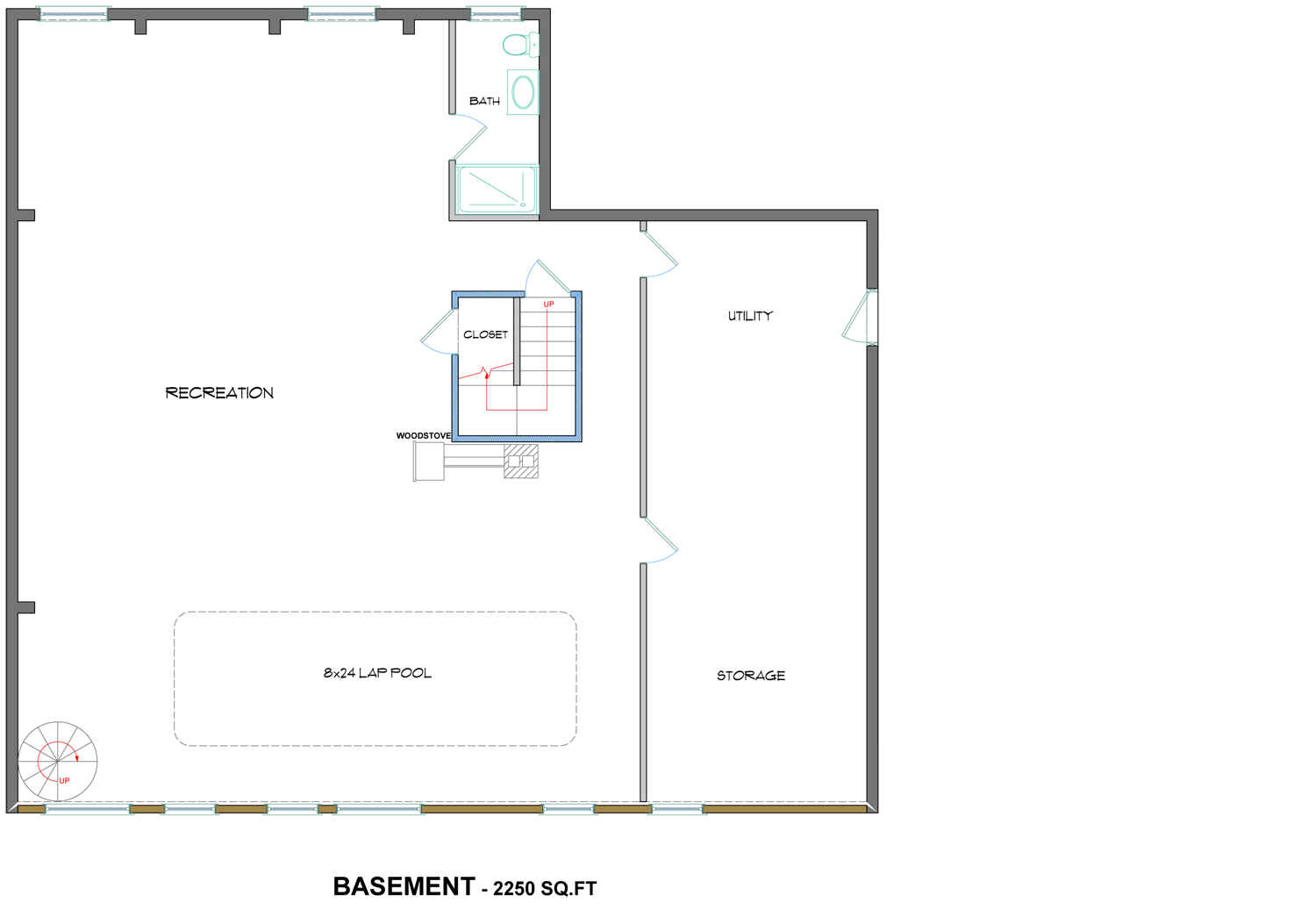 TERRA has the dual pitch roof popularized by Hawaiian architect C.W. Dickey. This is the perfect roof for solar - a steep pitch for the winter heating panels, and a shallow pitch for the PV electric panels. The steep "attic" allows for natural cooling with the "Corkscrew" air flow induced by the attic window arrangement. The TERRA has 2256 square feet on one level, with 2256 square feet in the basement. TERRA has 3 bedrooms and two baths, with a shower/bathroom in the basement. The original TERRA had a lap pool in the basement, with a unique "bridge" over the pool in the sunspace